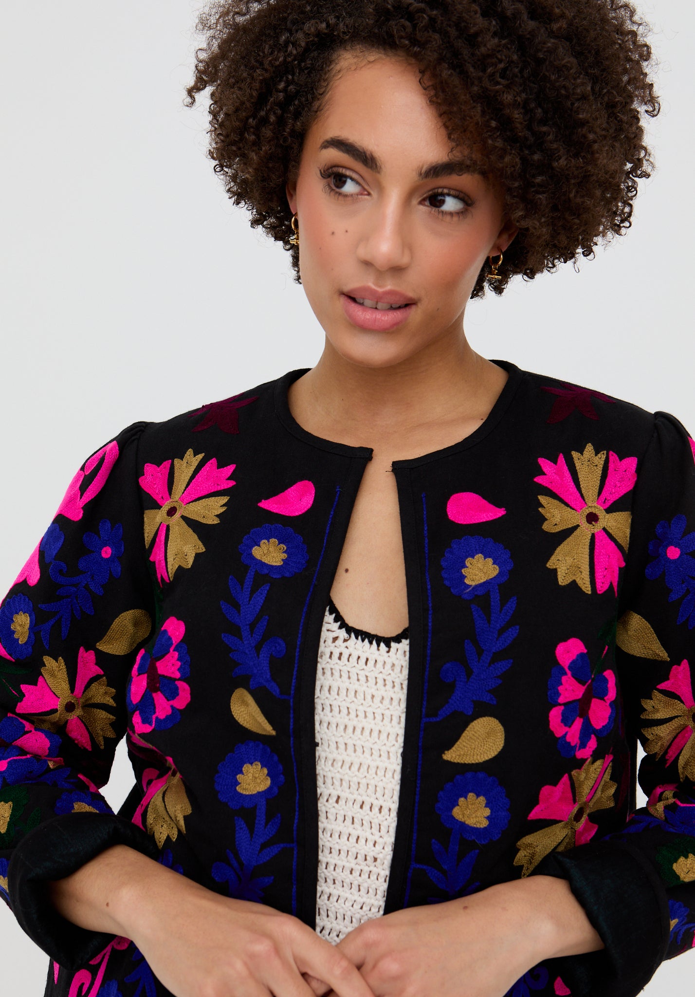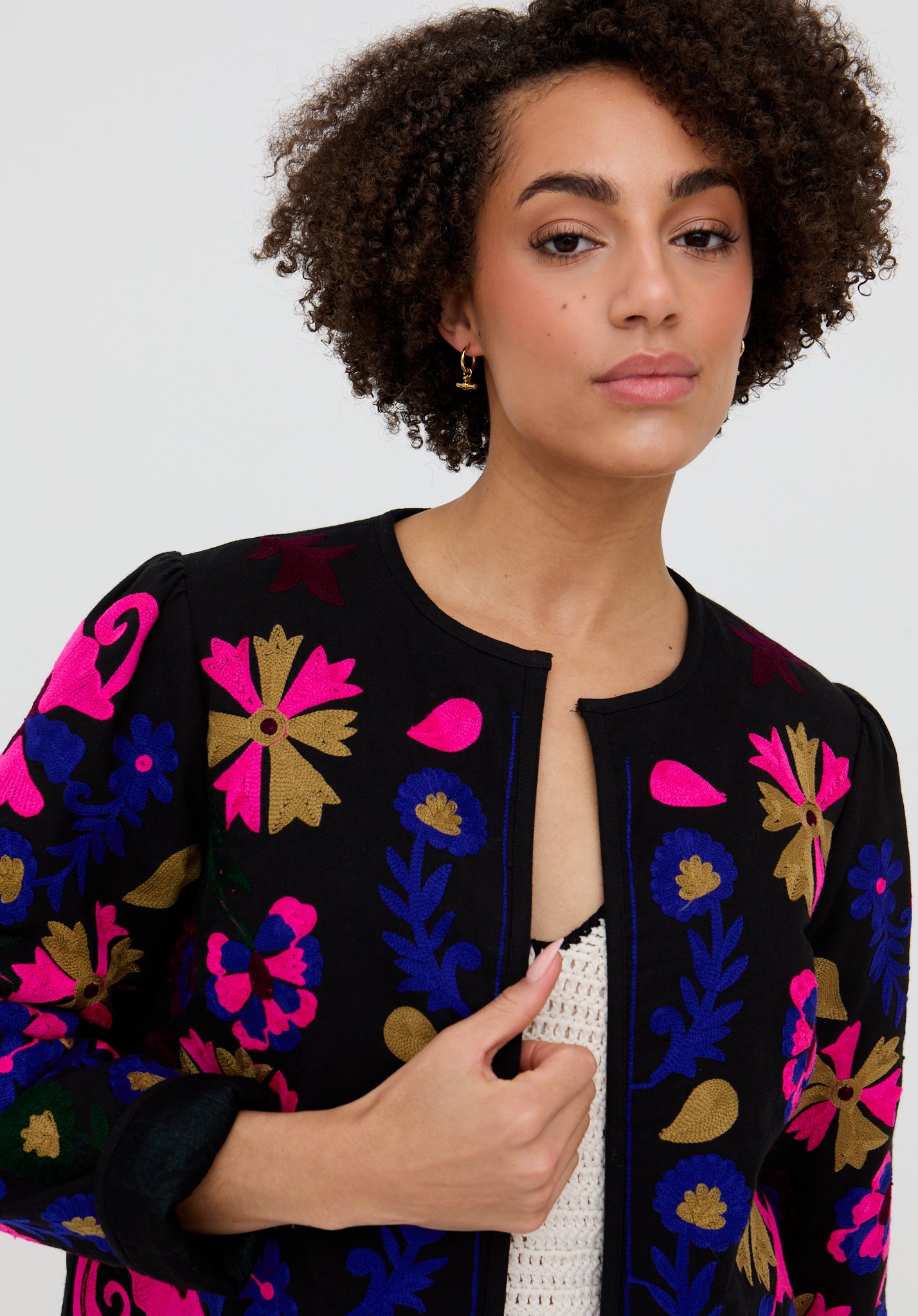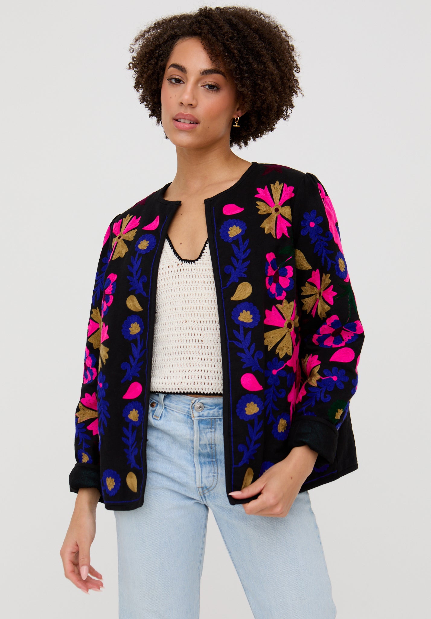 The Halen jacket layers warmth with artistry, featuring soft quilting and eye-catching embroidery in contrasting colours. Finished with an easy eyelet fastening, it’s the perfect throw-on for adding a boho edge to cooler days.