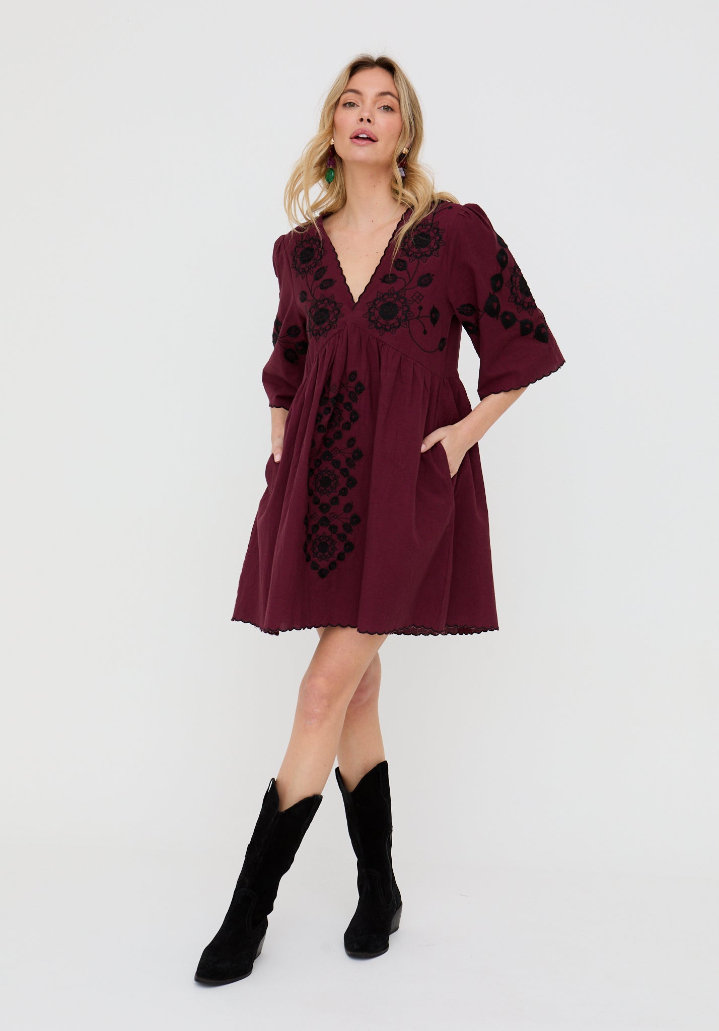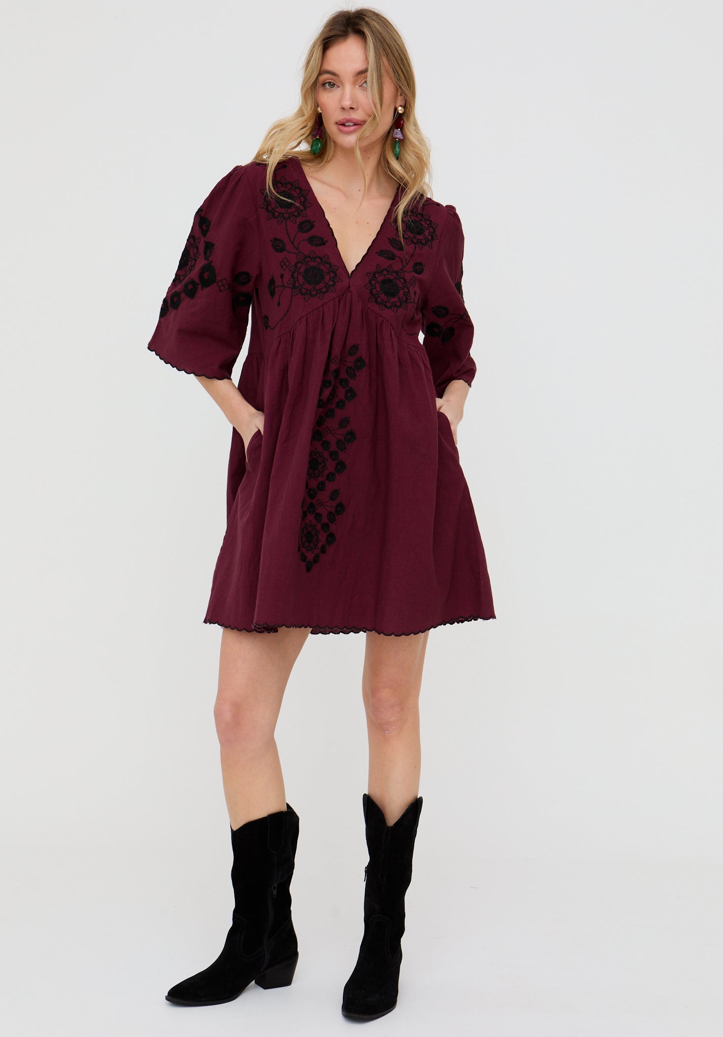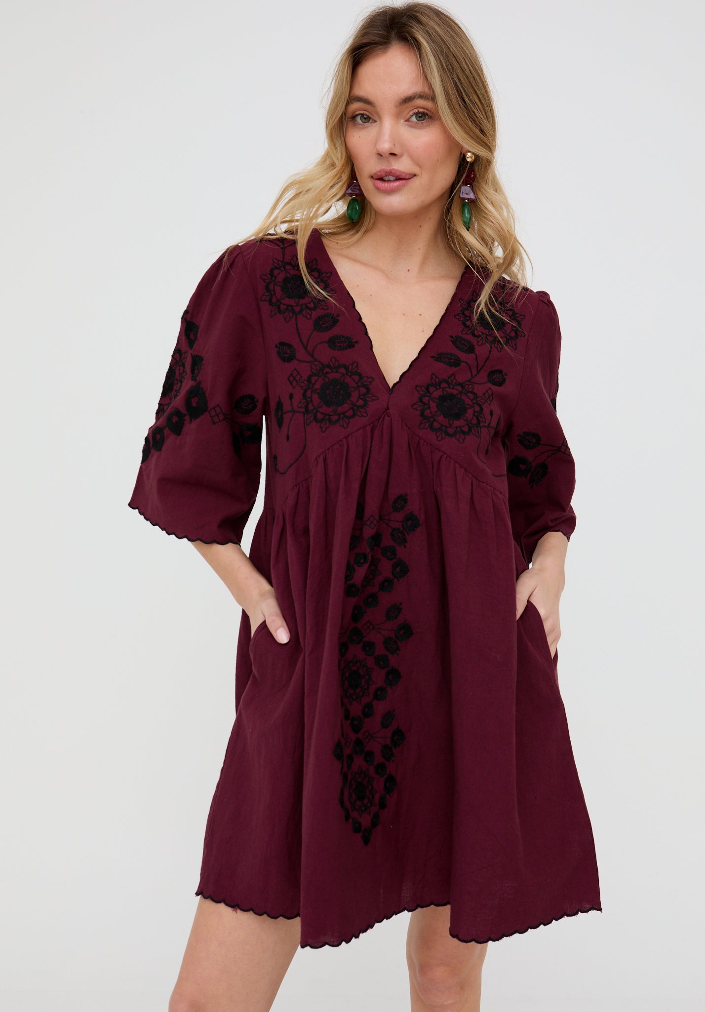A Raffya favourite, the Arabella mini dress is a timeless boho staple elevated with intricate embroidery. Designed with a flattering V-neckline and an easy, wearable silhouette, it’s finished in rich burgundy for effortless day-to-night appeal.