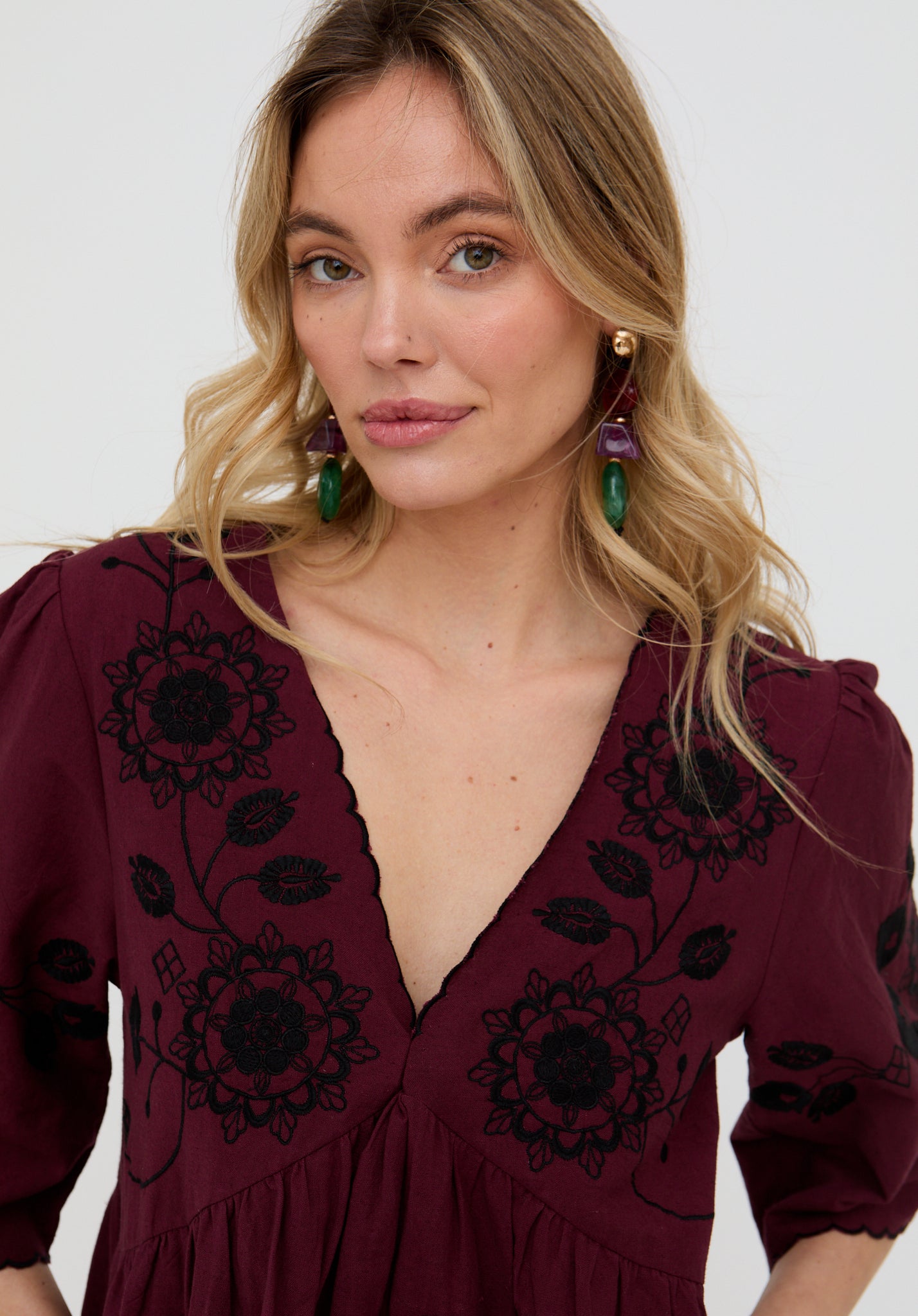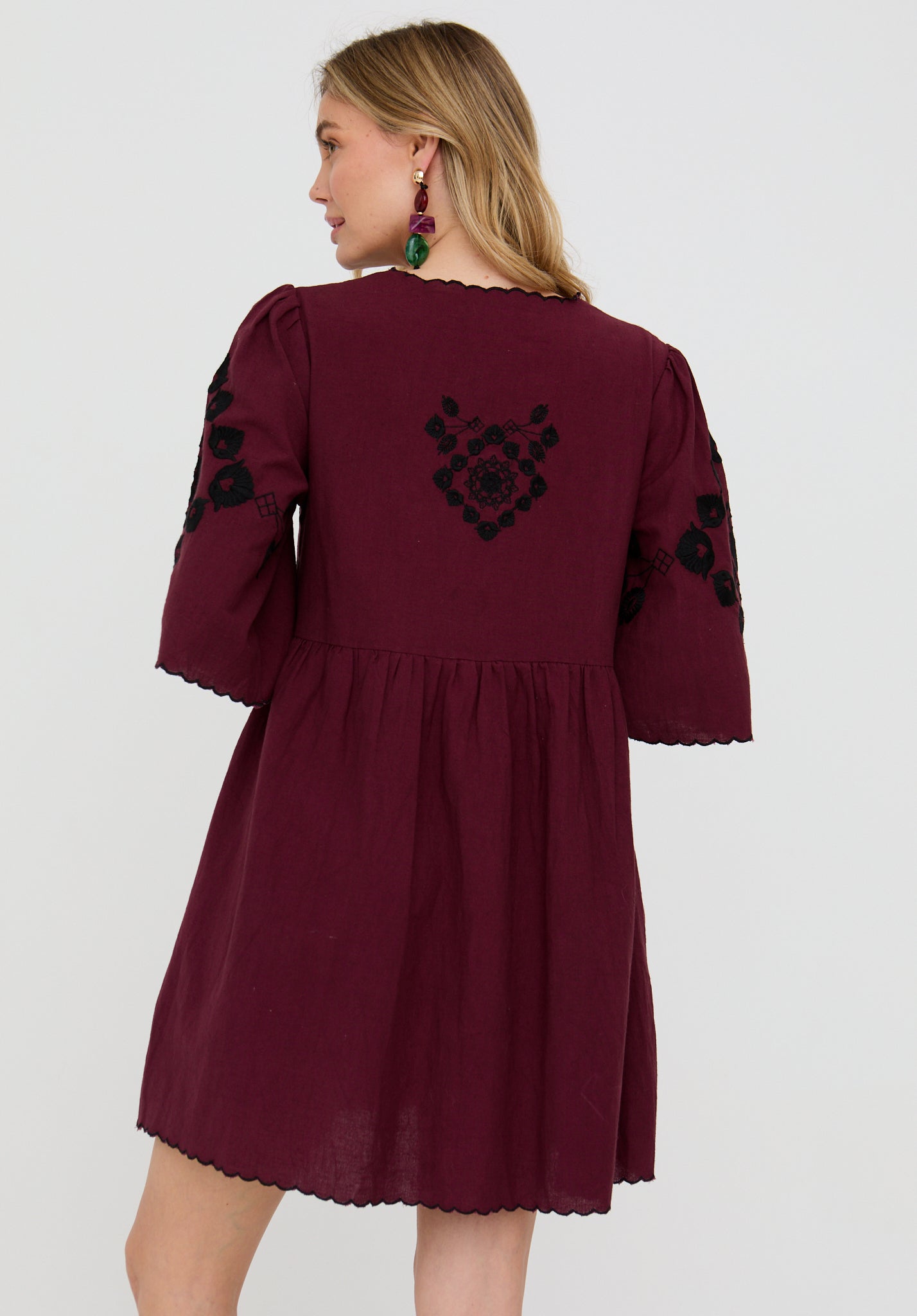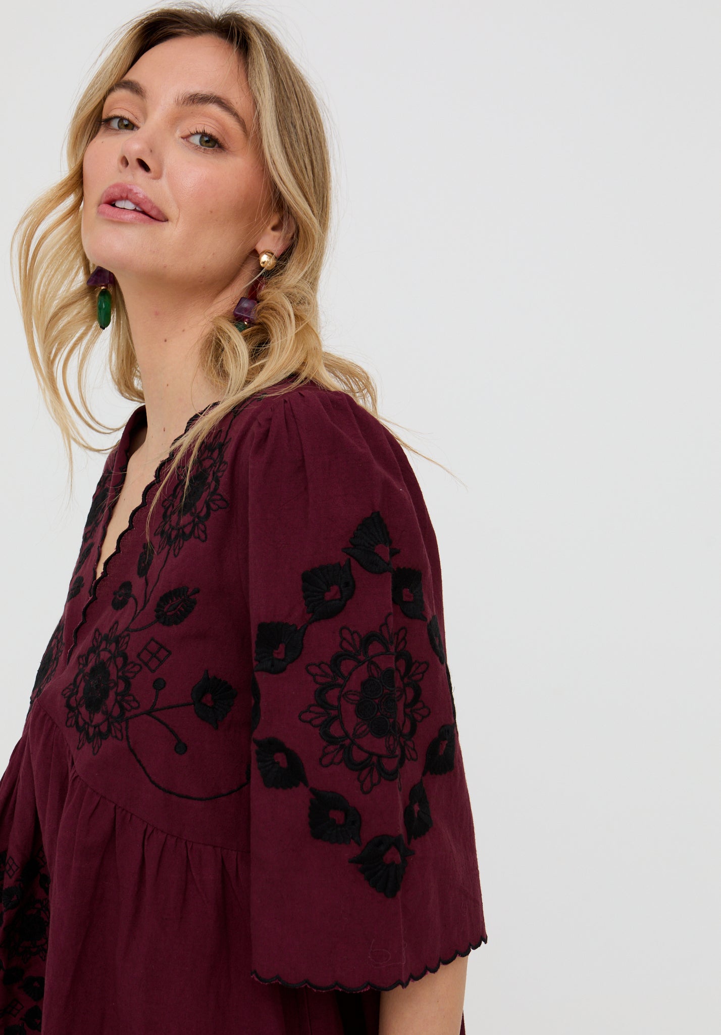 A Raffya favourite, the Arabella mini dress is a timeless boho staple elevated with intricate embroidery. Designed with a flattering V-neckline and an easy, wearable silhouette, it’s finished in rich burgundy for effortless day-to-night appeal.