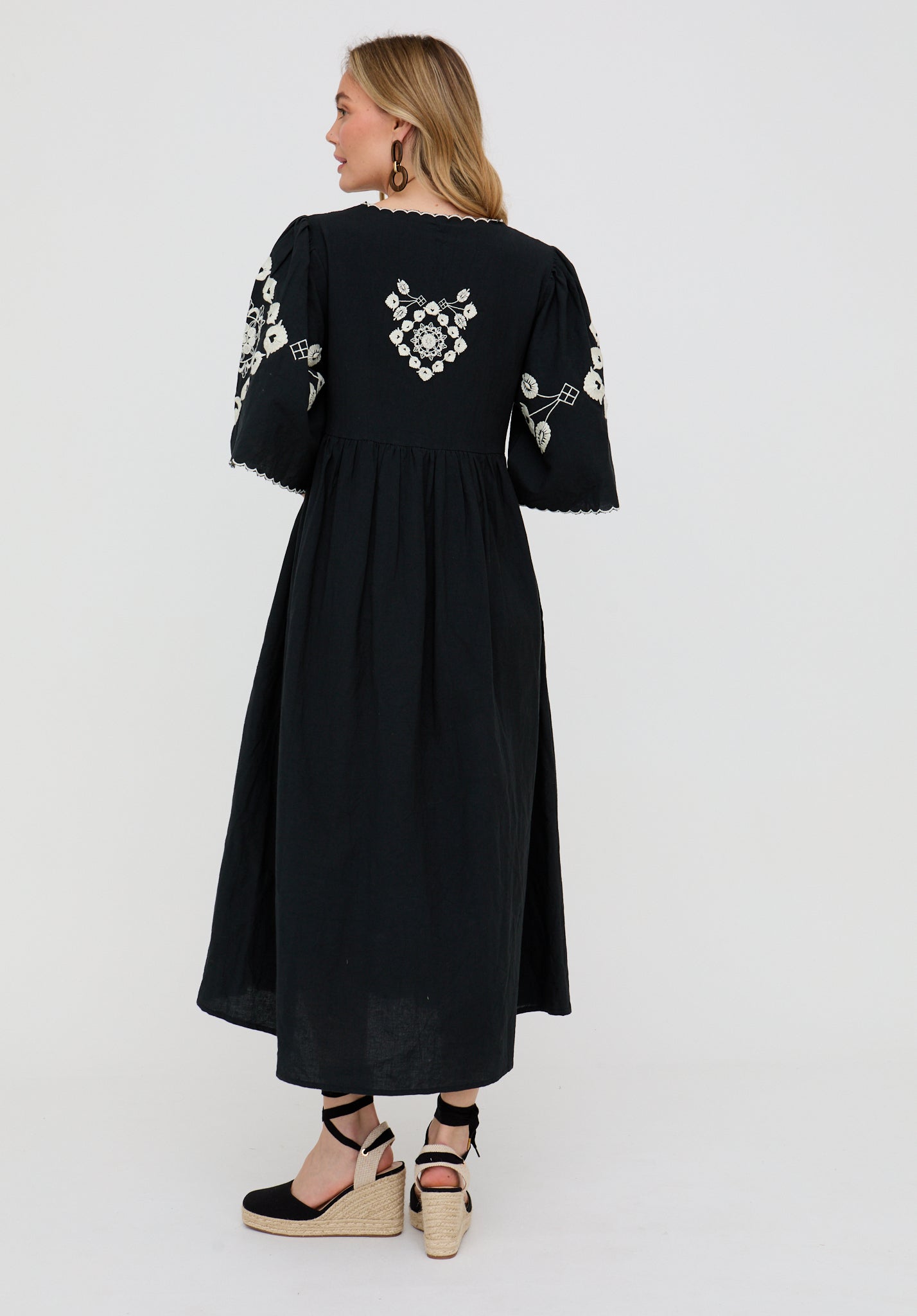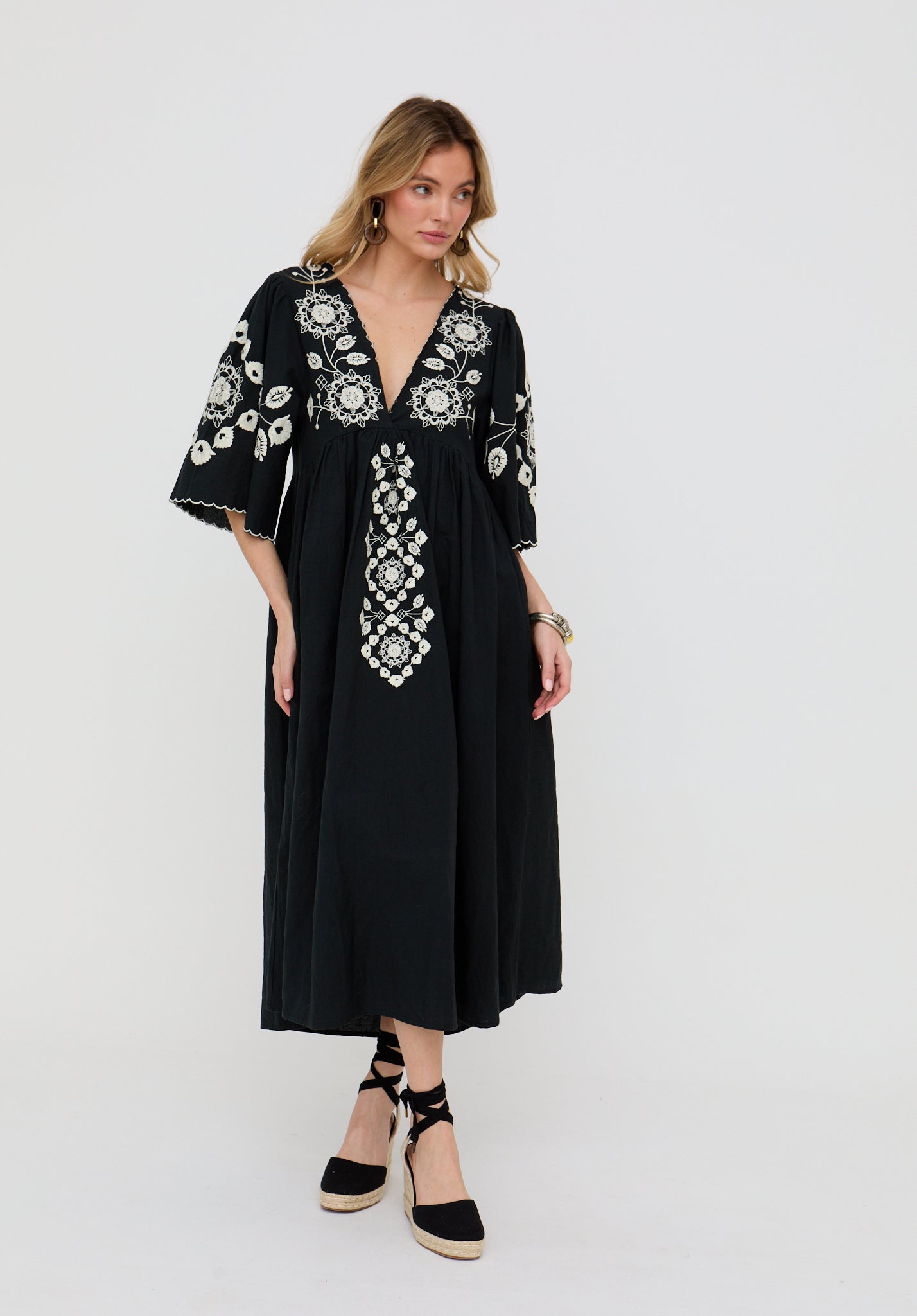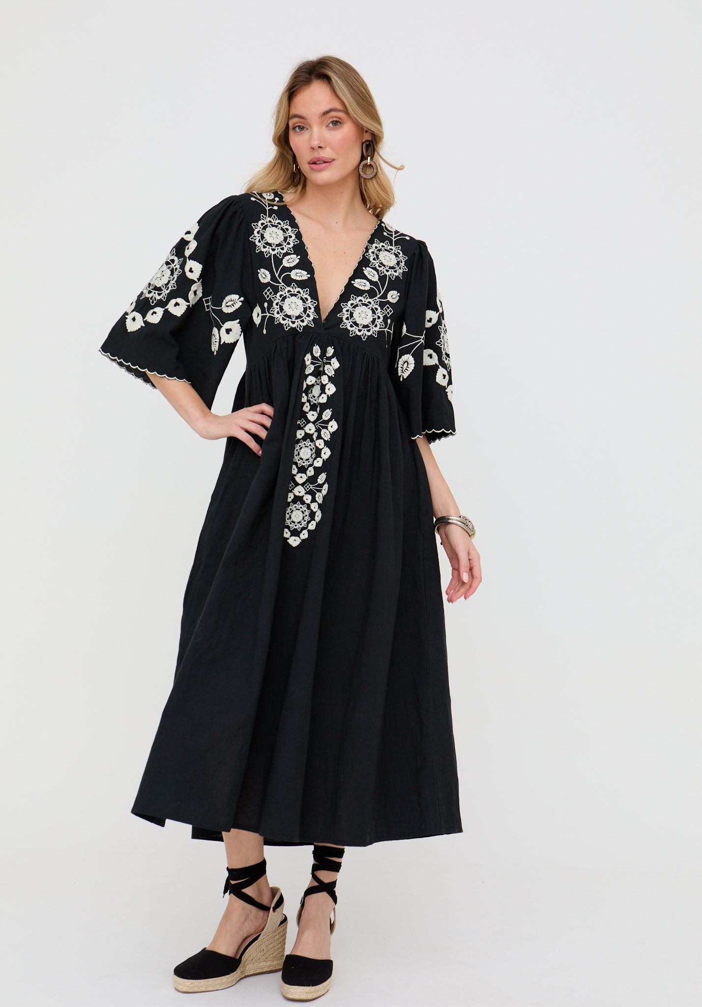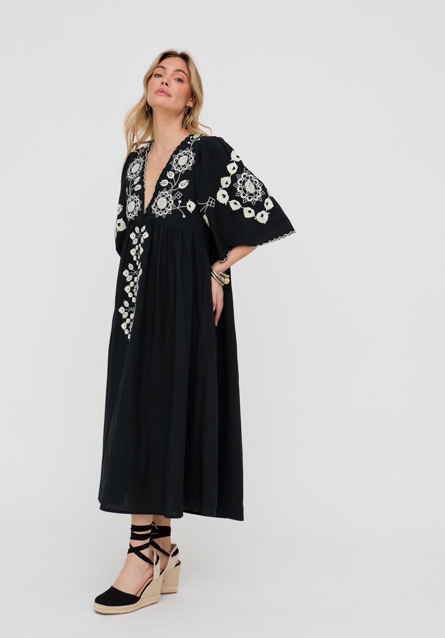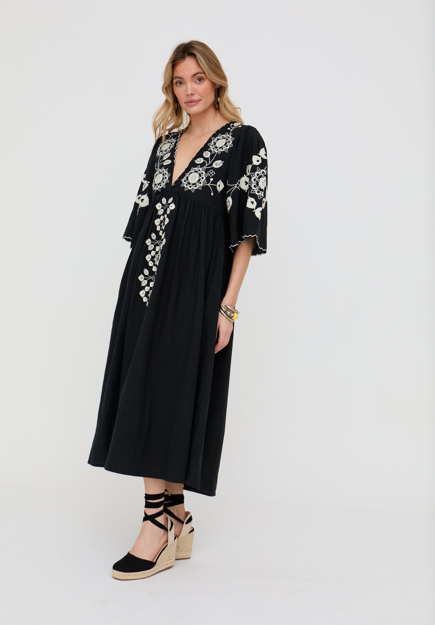 The Arianna maxi dress blends timeless elegance with intricate boho detail. Designed with a flattering V-neckline and finished with delicate embroidery, it flows effortlessly in classic black for a look that feels both refined and relaxed.