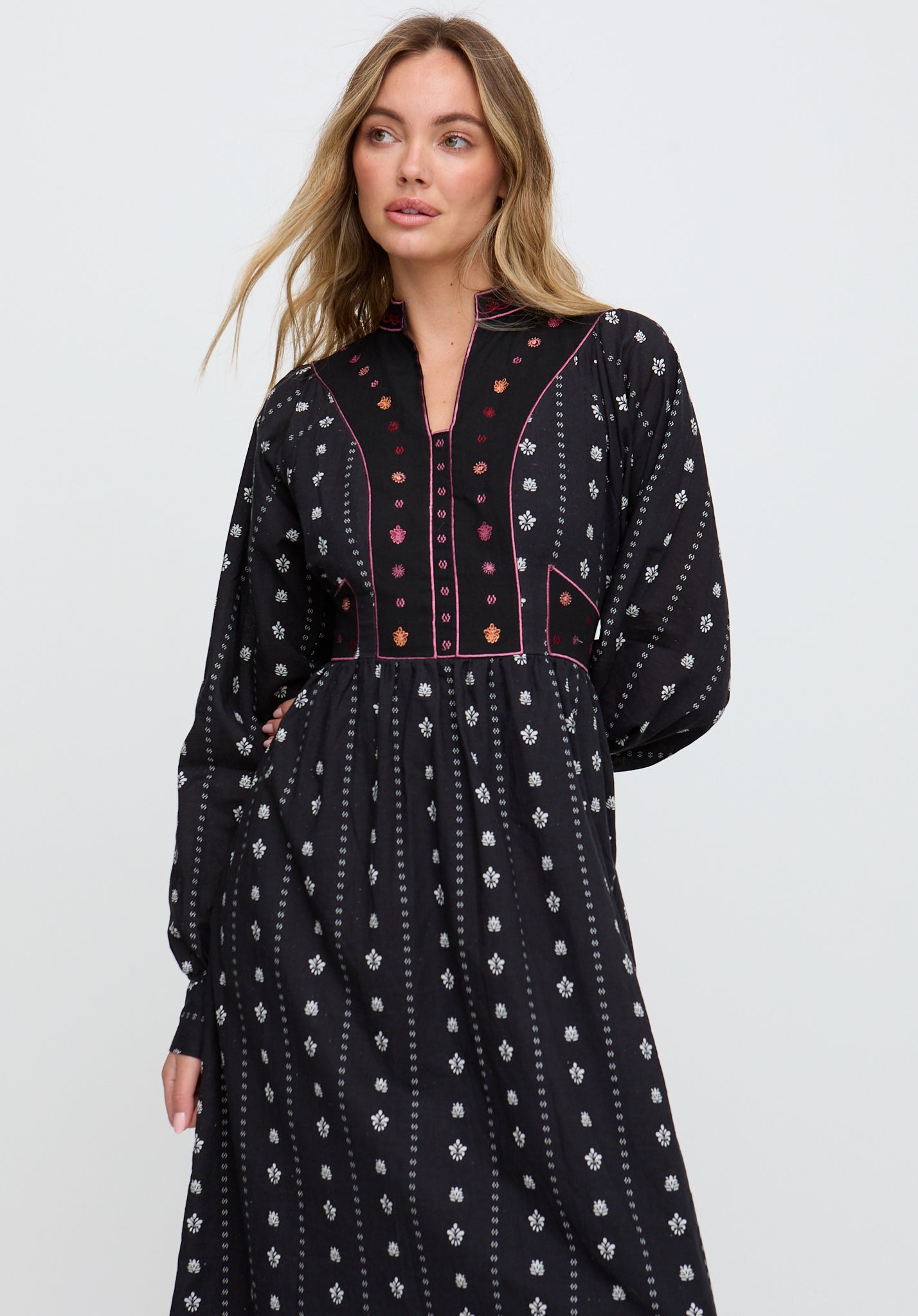 The Ocean maxi dress pairs timeless black with bold, contrasting embroidery for a striking boho statement. Featuring a block-print base, cuffed sleeves, and an open collar neckline, the look is elevated with an intricately embroidered bodice and a tie-back waist for effortless shape.