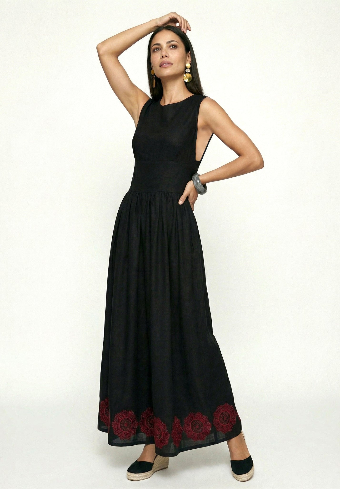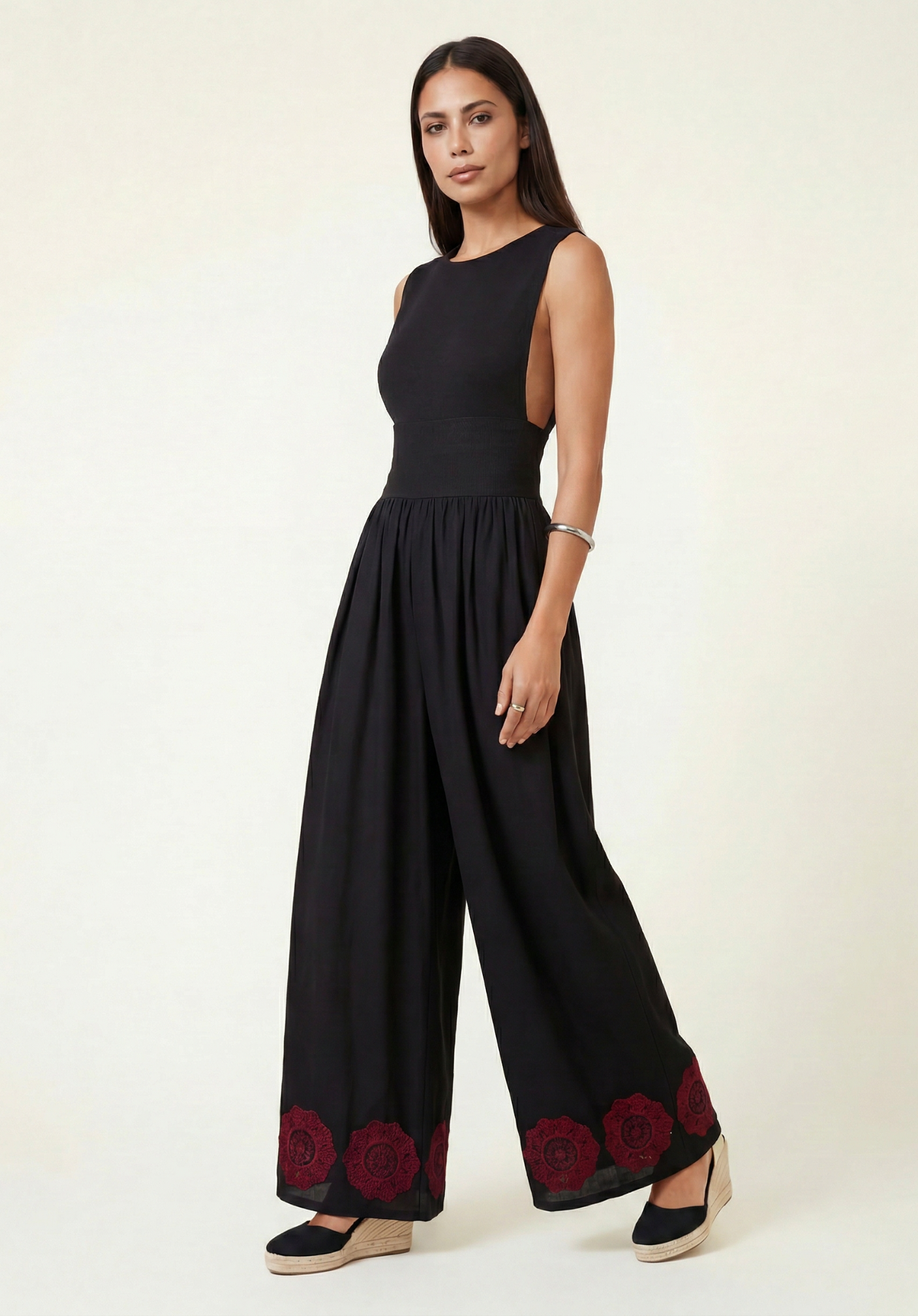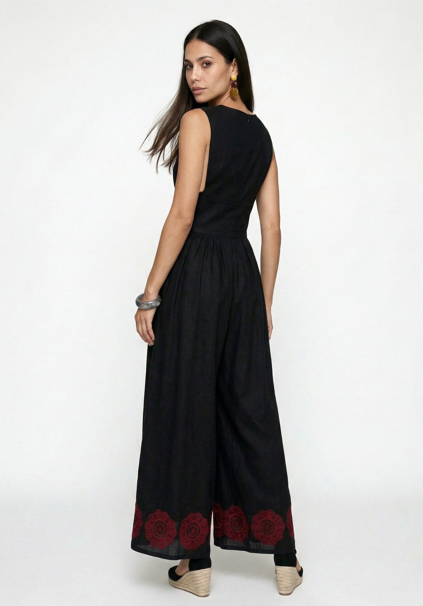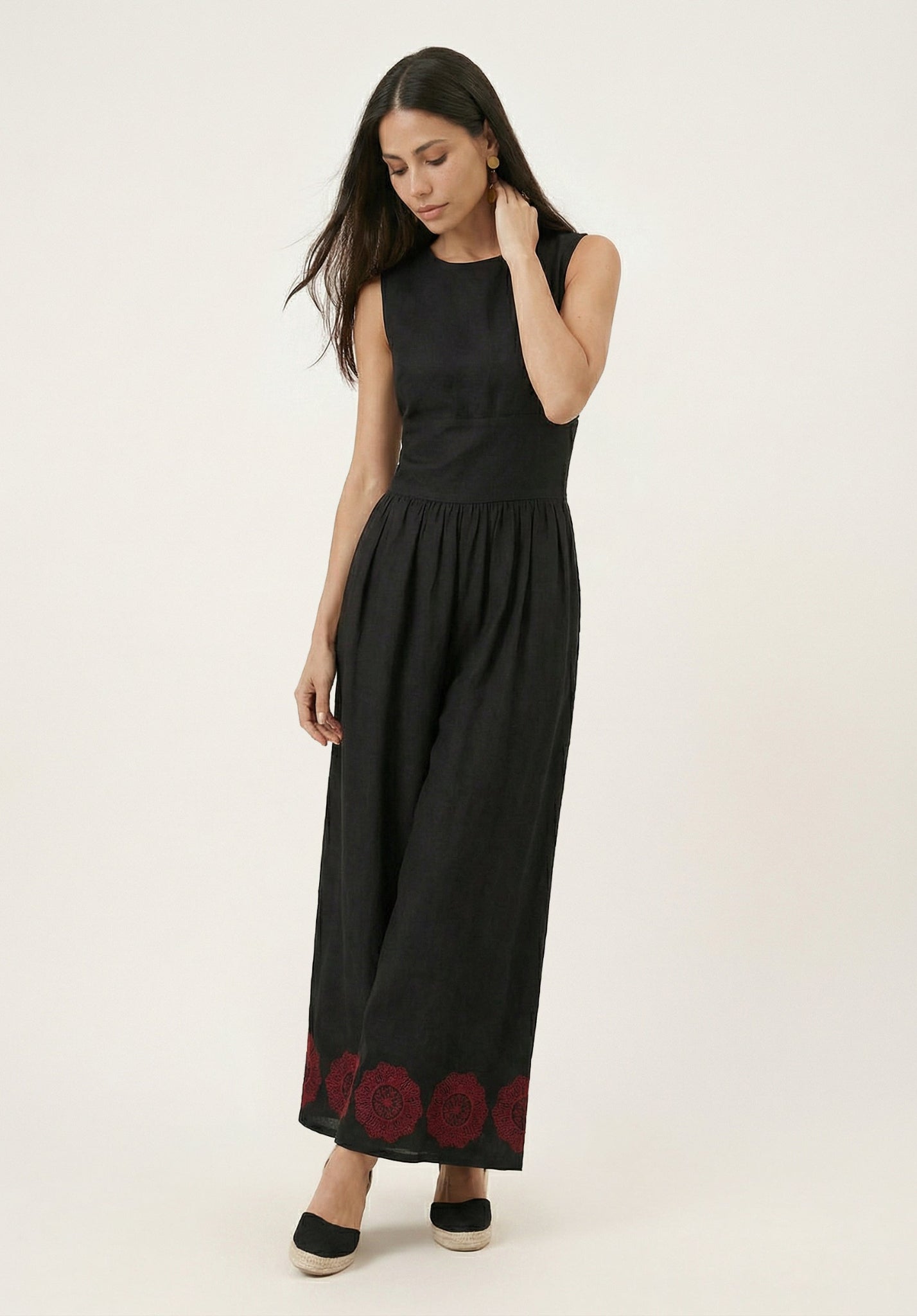 The Vanessa wide leg embroidered jumpsuit blends effortless sophistication with bold, artisanal detail. Designed in a flattering wide-leg silhouette, it drapes beautifully while the black base is elevated by striking red trim embroidery along the trouser cuffs, adding a distinctive, eye-catching finish. Easy to style and endlessly versatile, it’s a statement piece for any occasion.