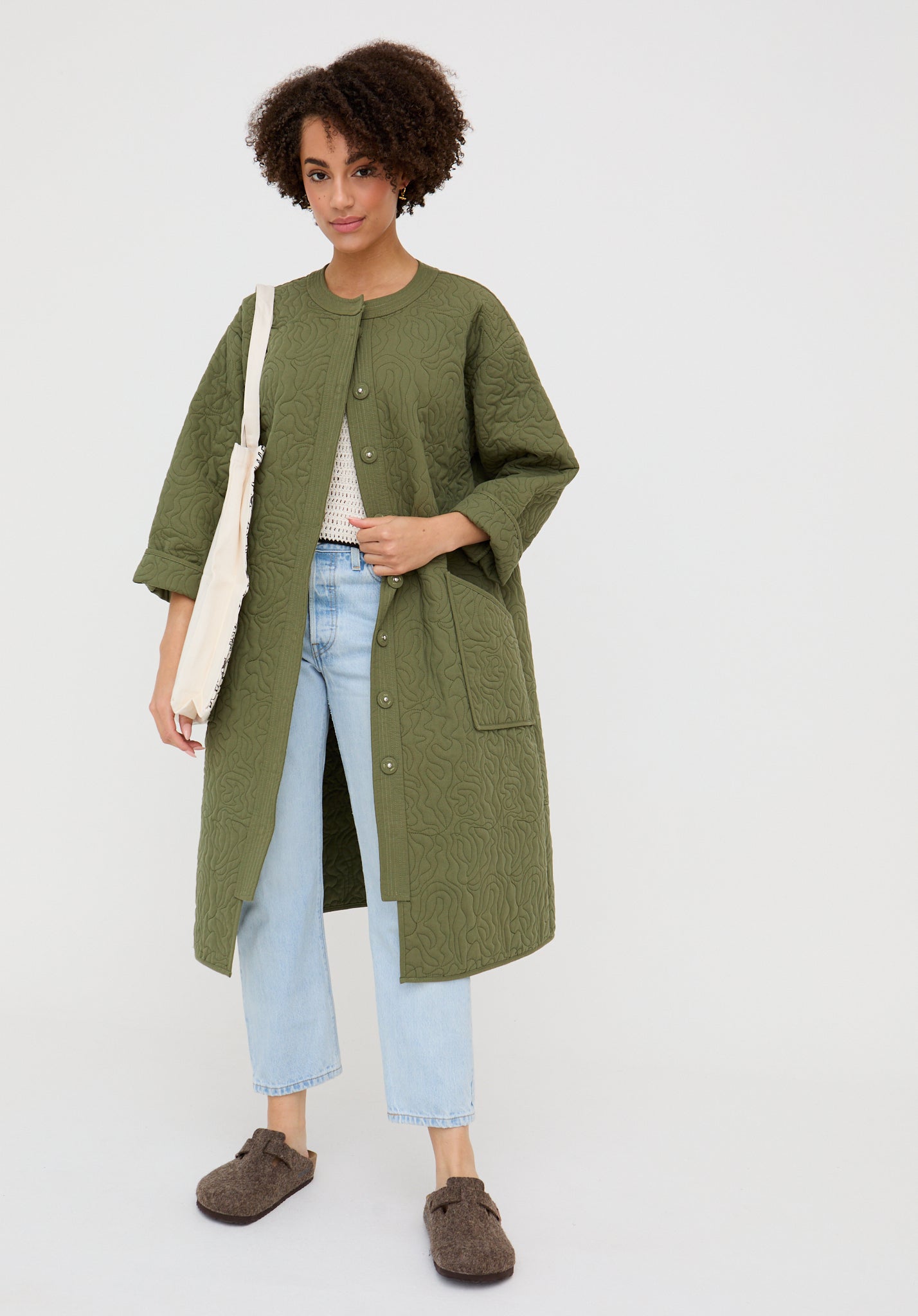 The Heidi coat offers a refined take on boho outerwear, with squiggly-print quilting adding subtle texture. Collarless with a hidden button fastening and fully lined for comfort, it’s a lightweight yet cosy layer for cooler days.