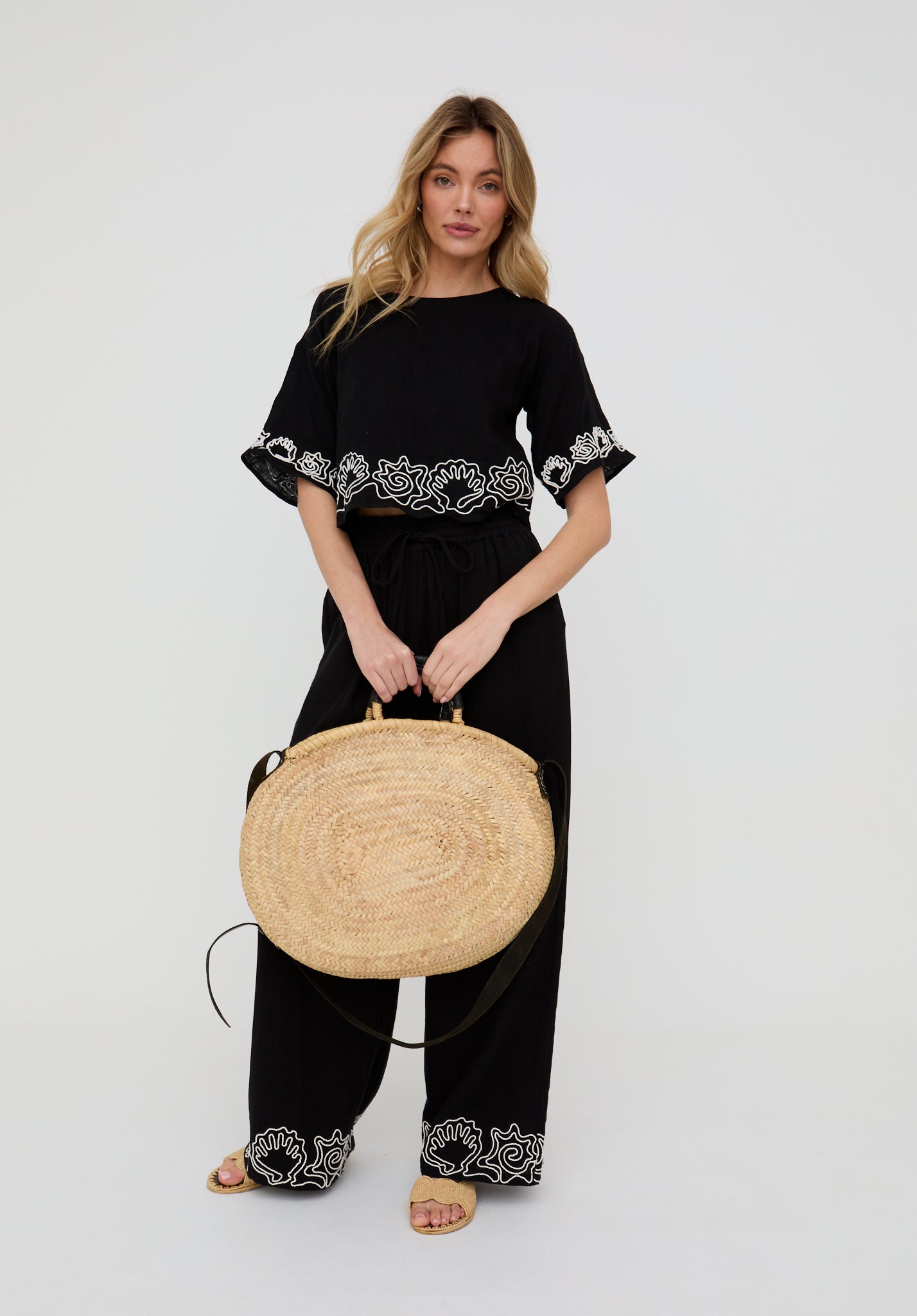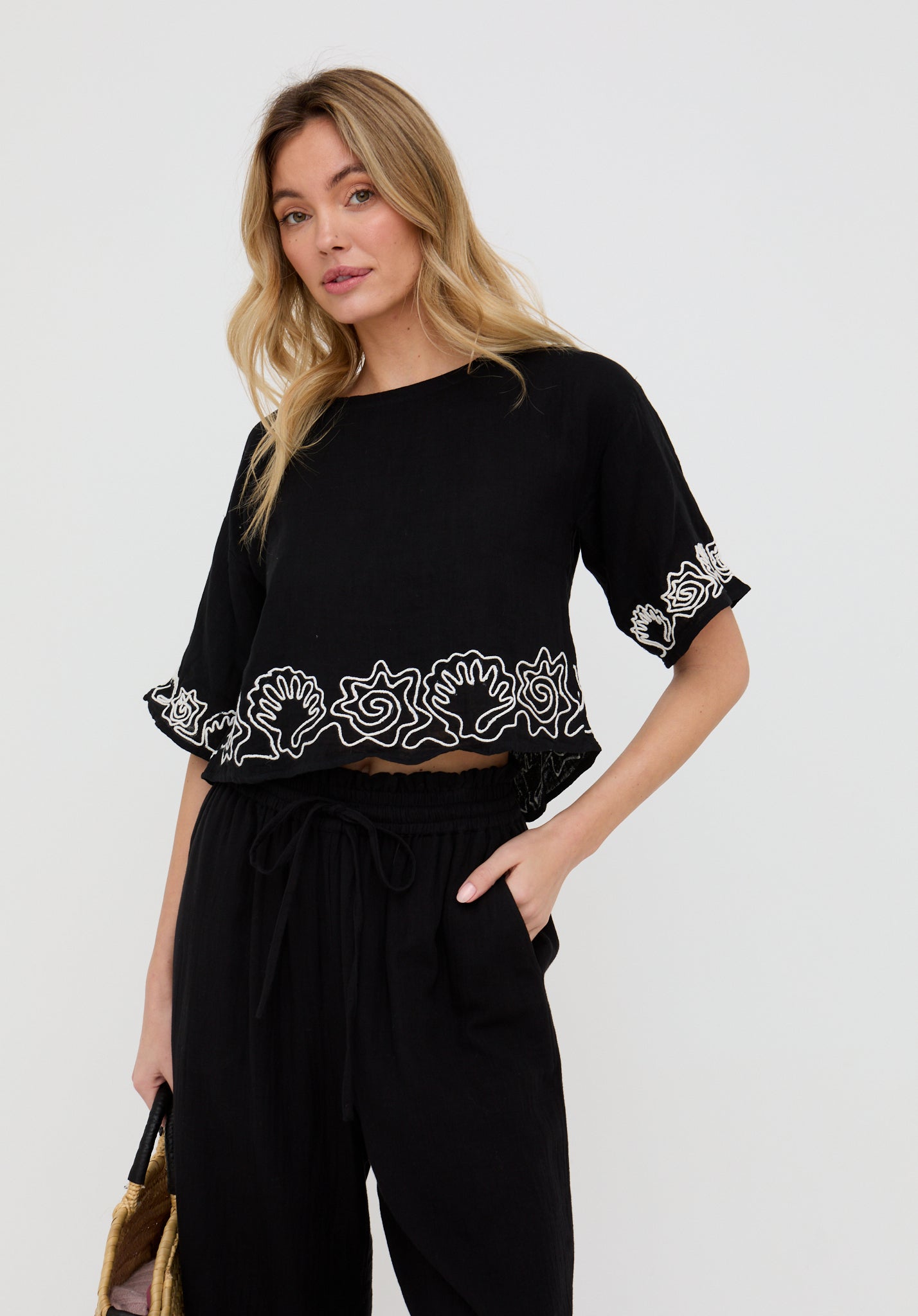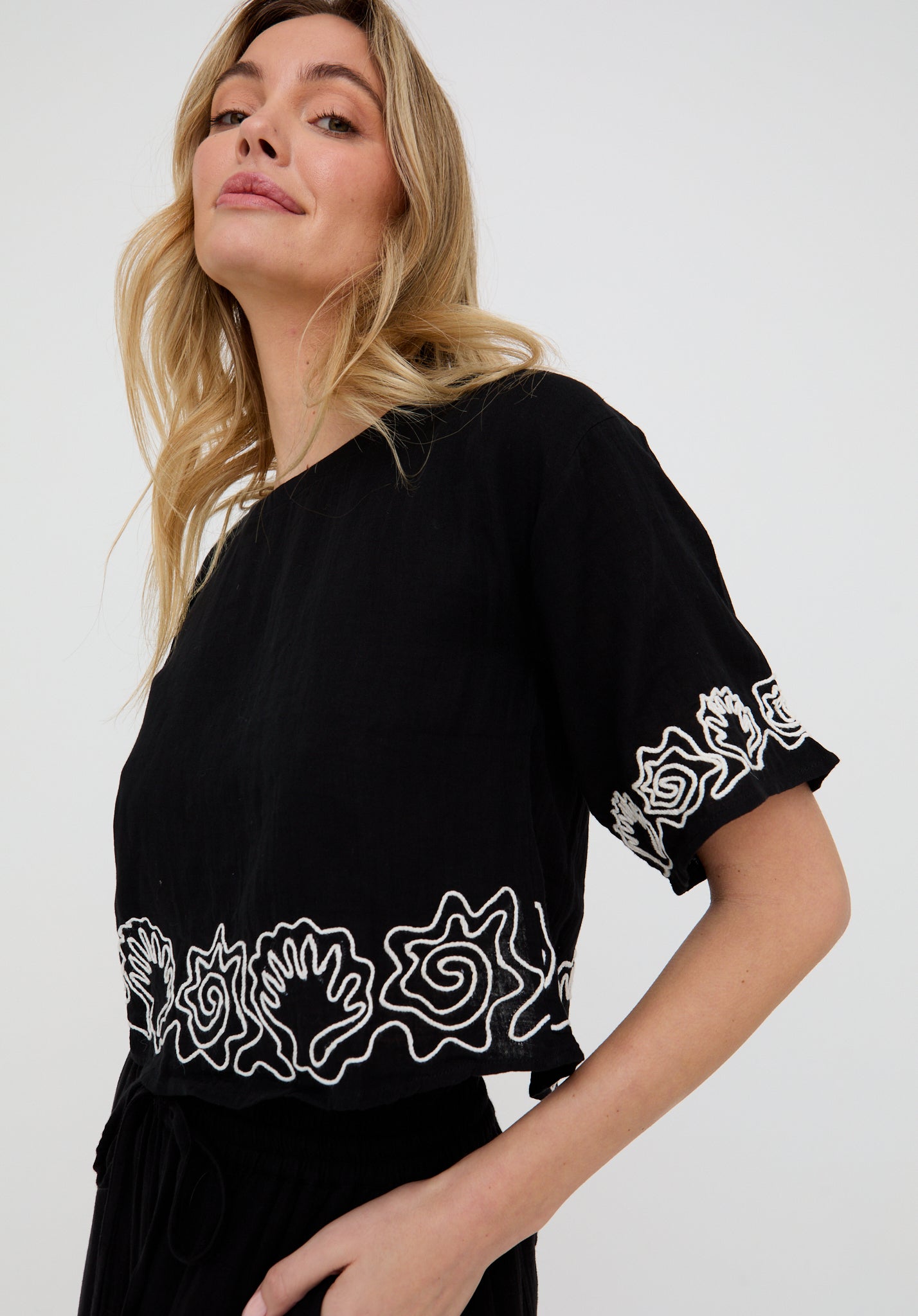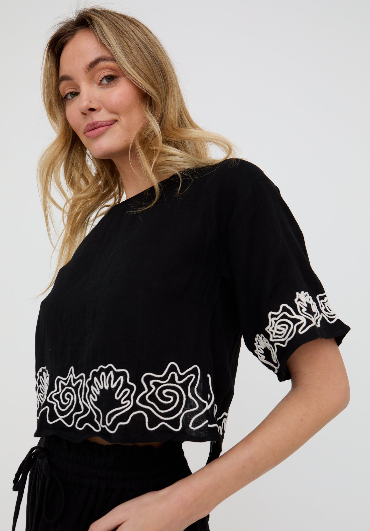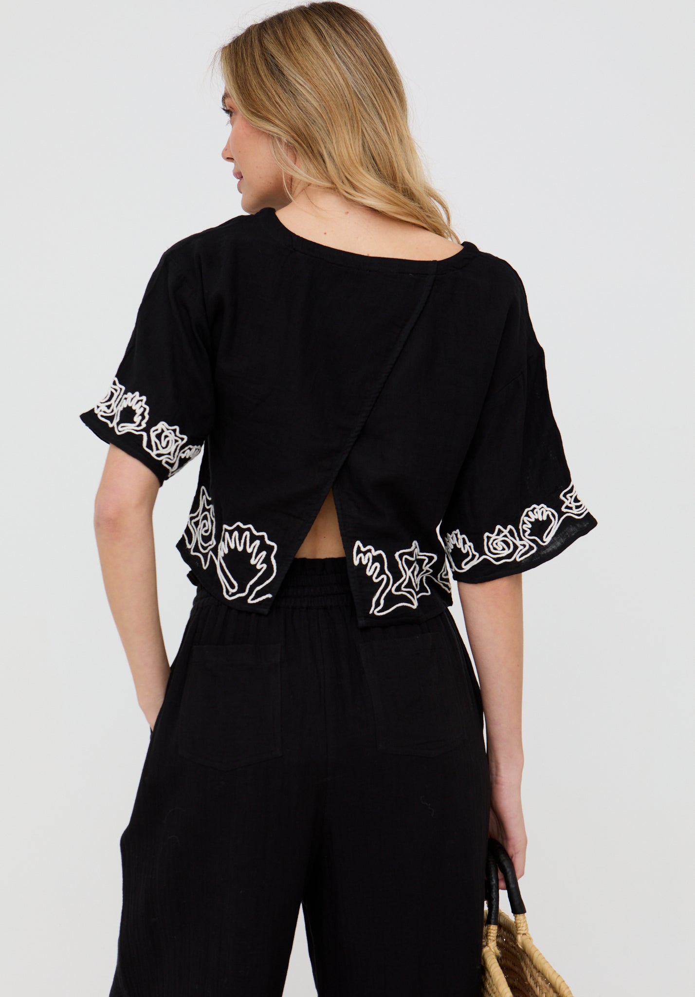 Designed to make a statement, the Milly open back blouse features intricate white embroidery that delicately contrasts against the black fabric, adding texture and visual interest to the otherwise minimalist silhouette.