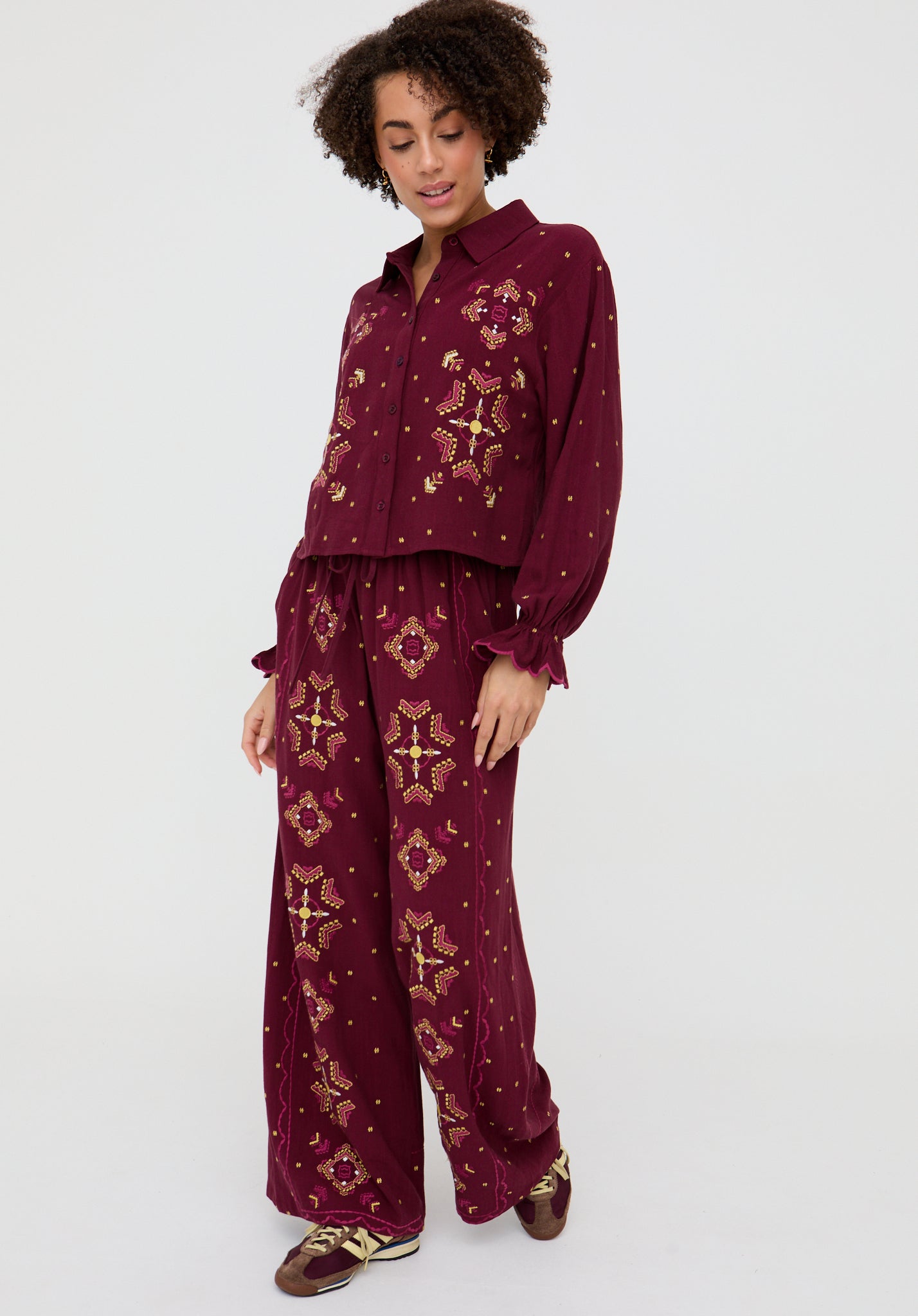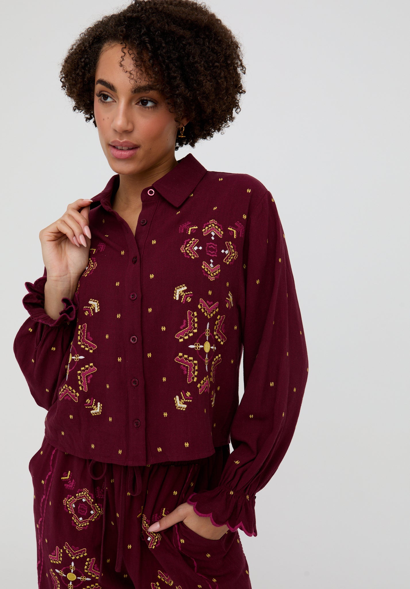 The Penny shirt combines a relaxed boxy fit with intricate embroidery and feminine detailing. Finished with elasticated sleeves, scalloped edging, and delicate button accents, it’s an easy linen blend piece to dress up or down. Pair with the matching Penny trouser for a coordinated look that’s both effortless and elevated.