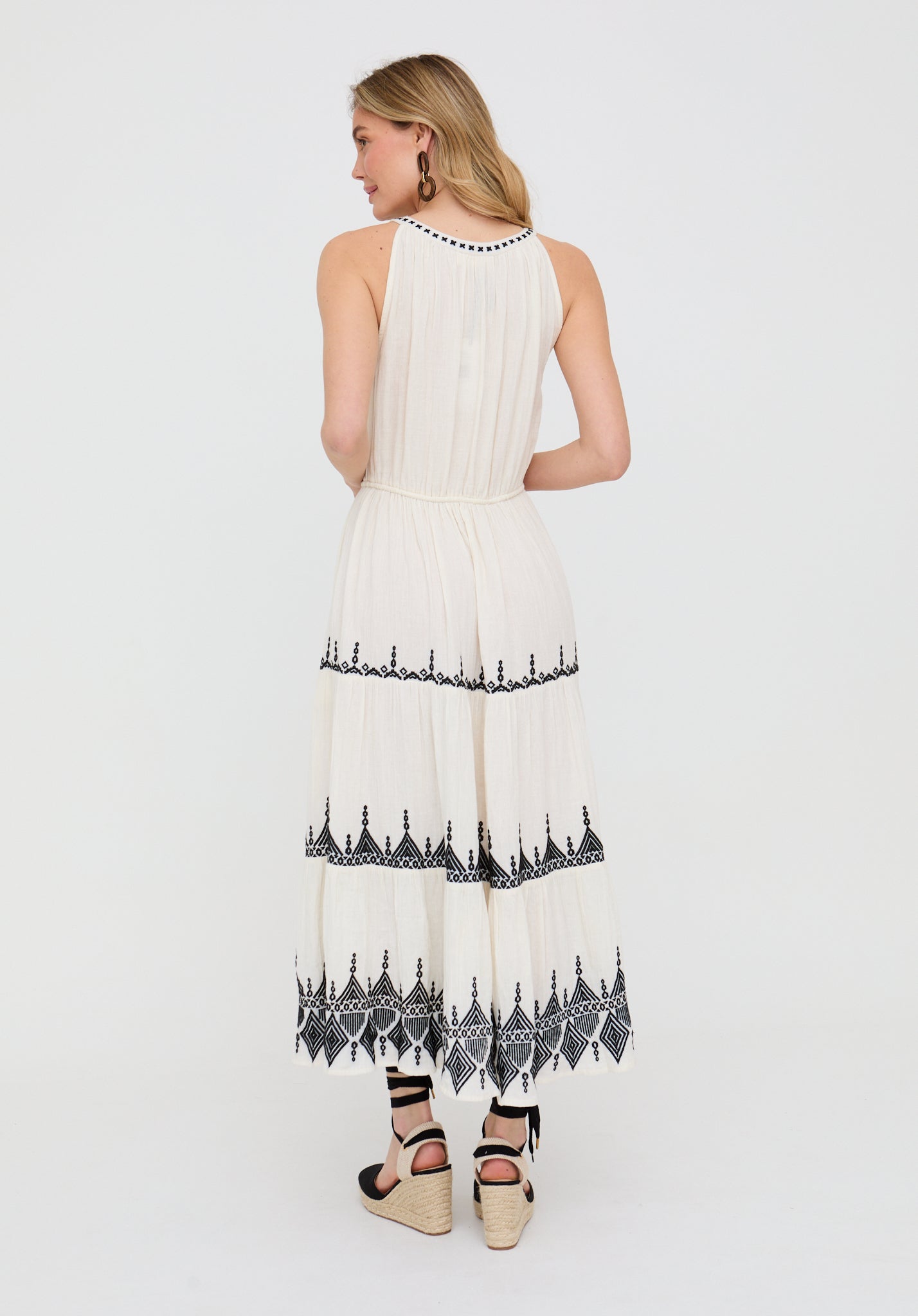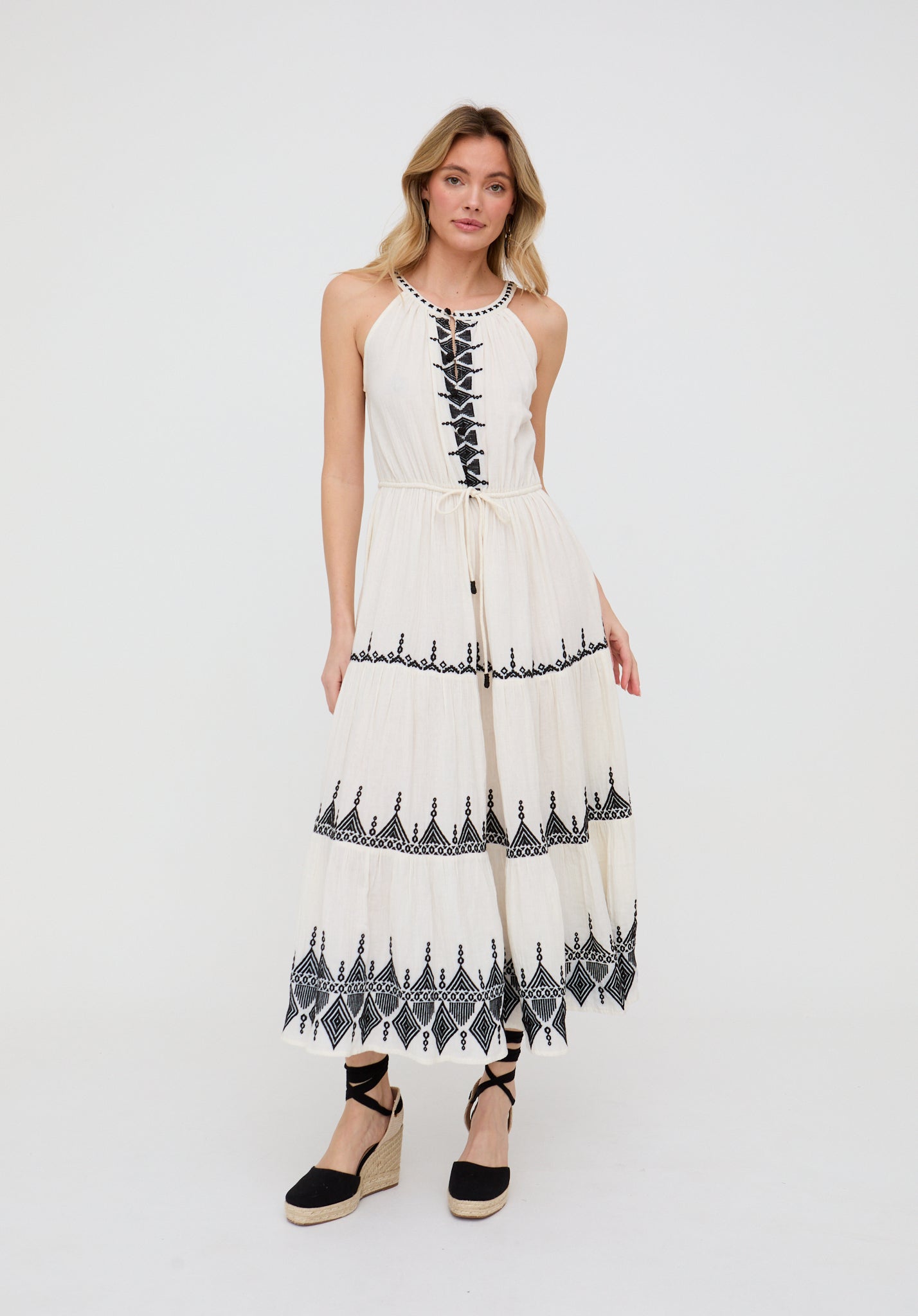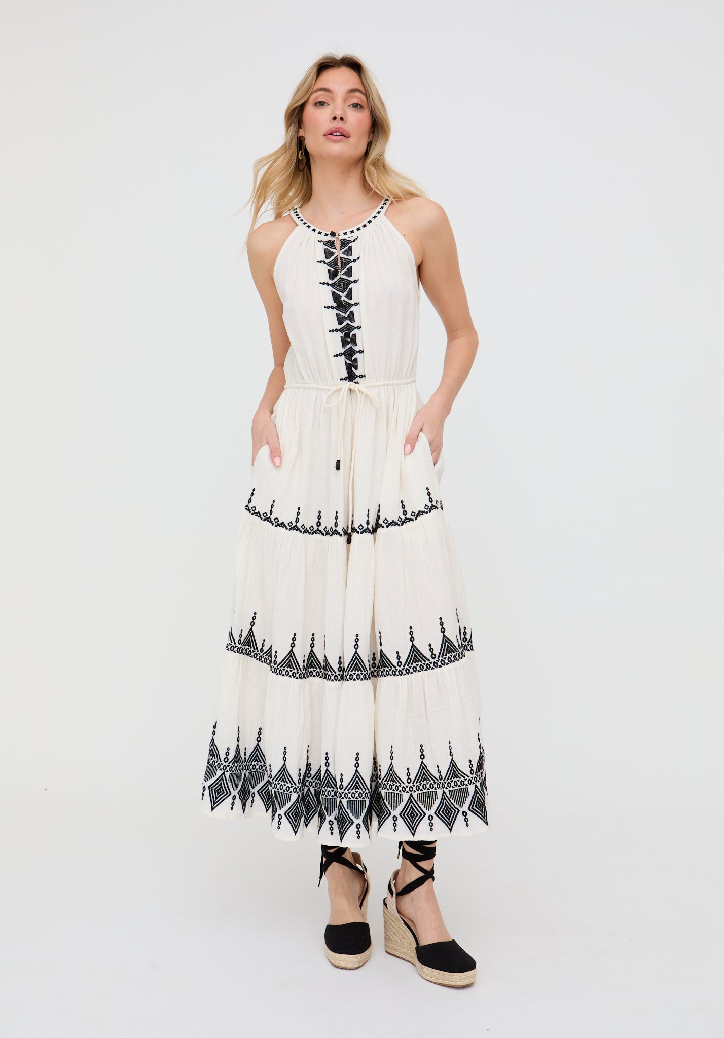 Our Mia embroidered maxi dress is a tiered style made from midweight cotton showcasing black geometric embroidery on a white base. Designed with a button front, adjustable drawstring waist in midi length.