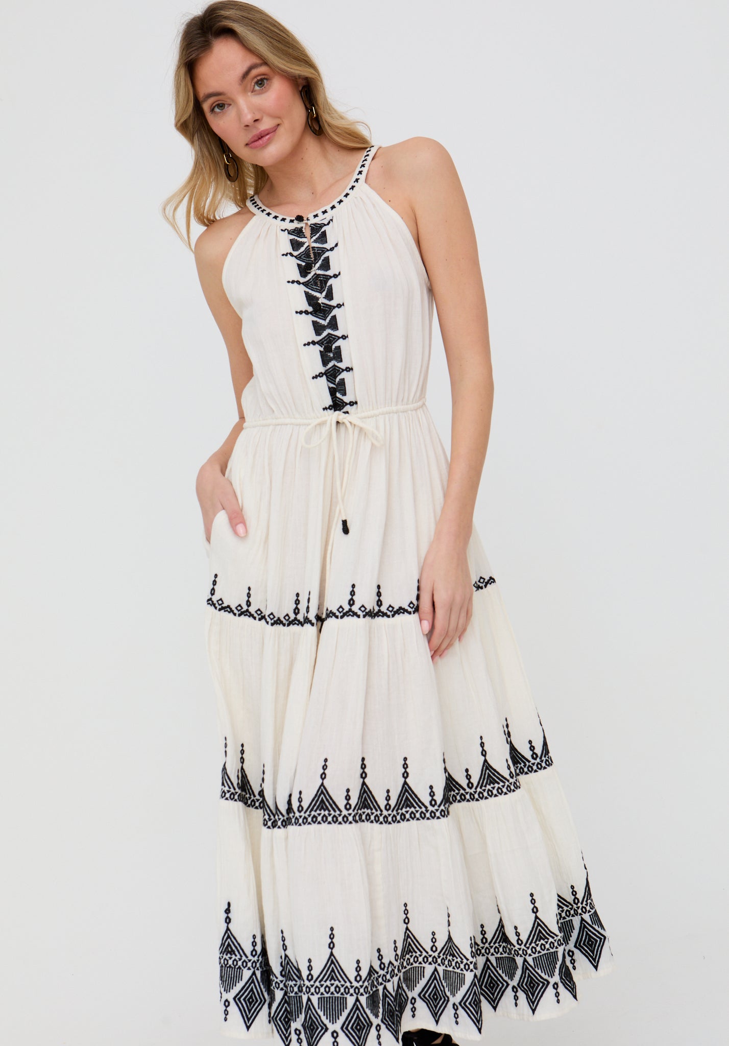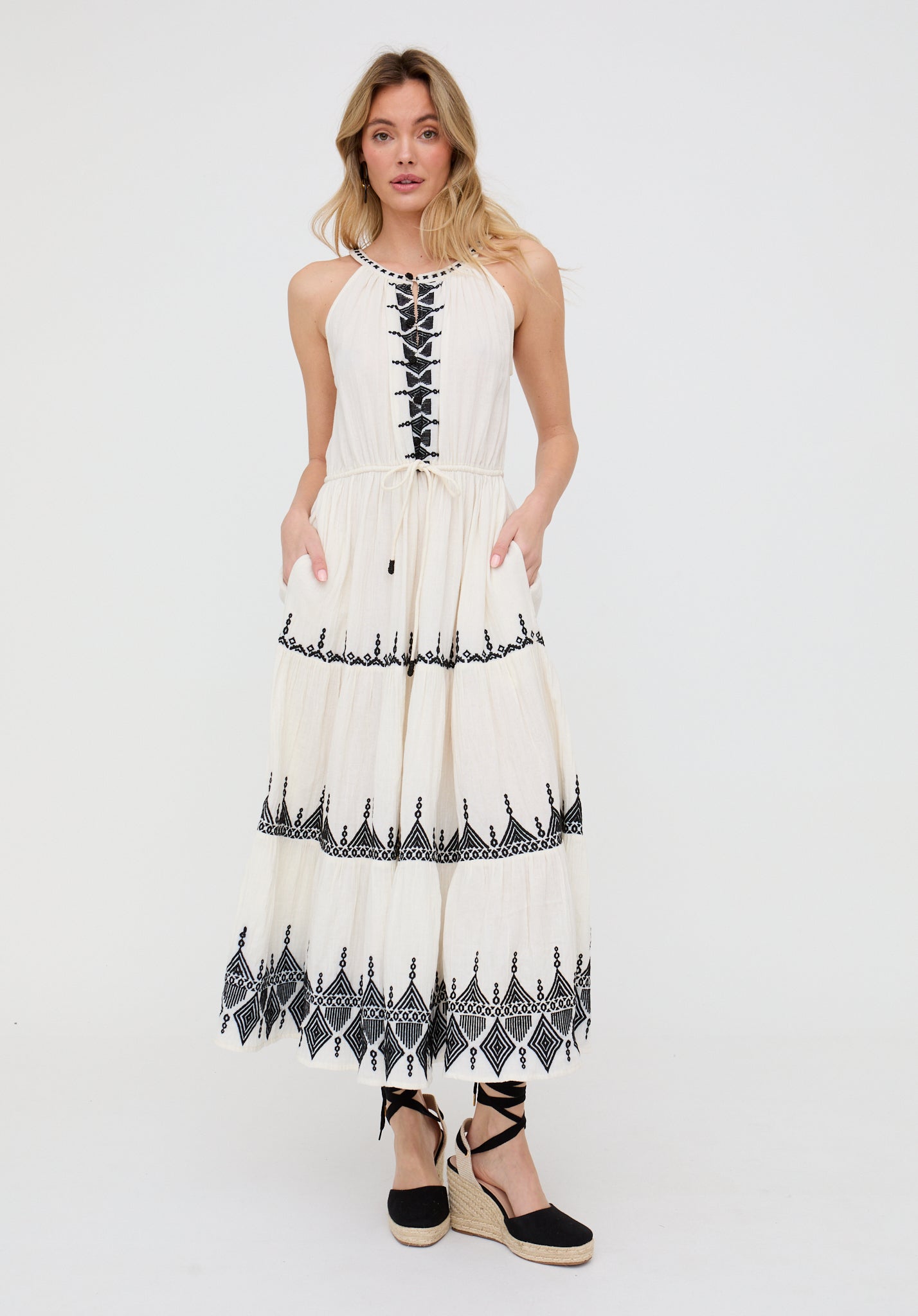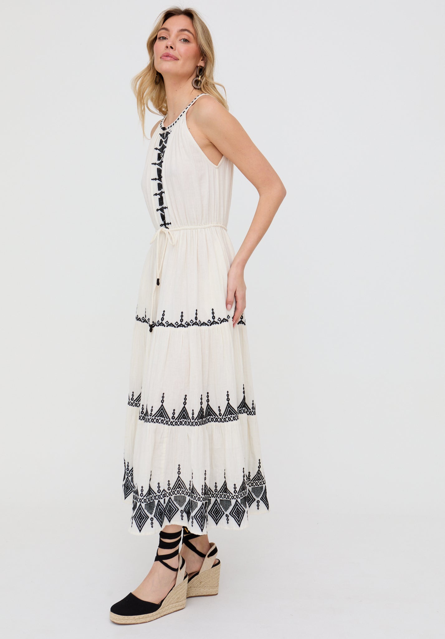 Our Mia embroidered maxi dress is a tiered style made from midweight cotton showcasing black geometric embroidery on a white base. Designed with a button front, adjustable drawstring waist in midi length.