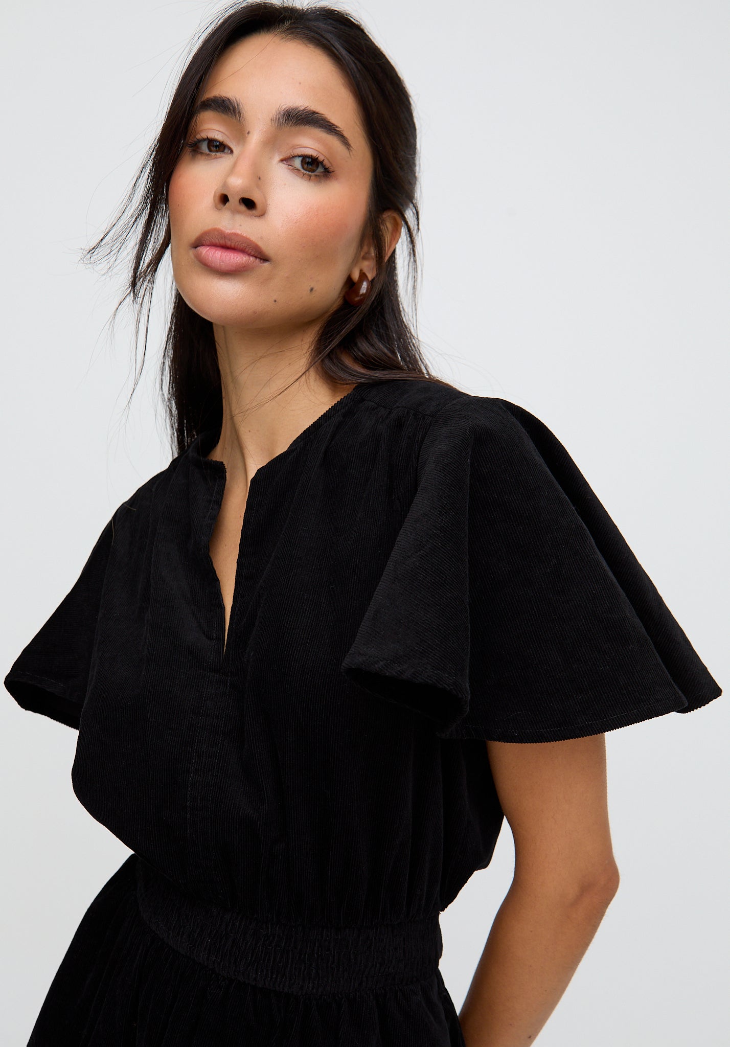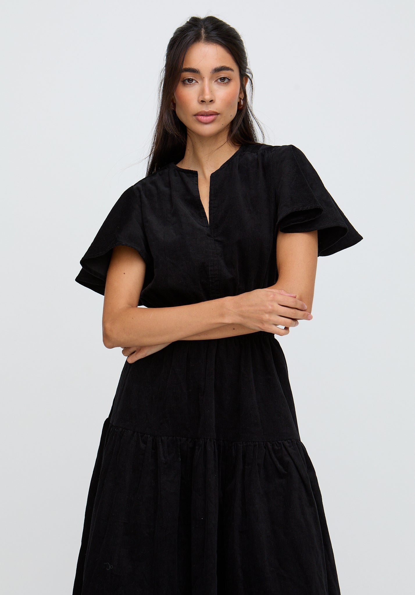 PREORDER Candice Flutter Sleeve Corduroy Maxi Dress In Black