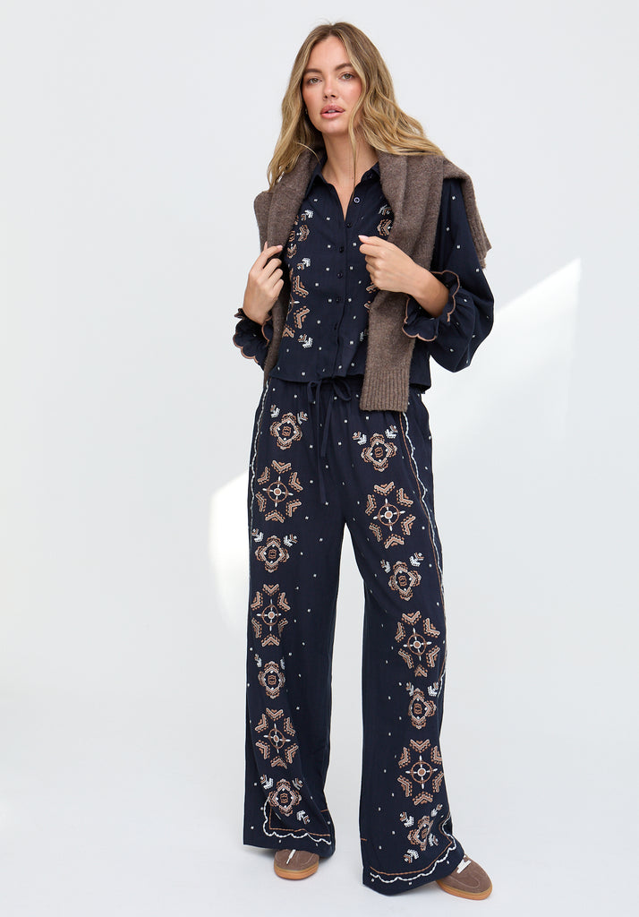 The Penny shirt combines a relaxed boxy fit with intricate embroidery and feminine detailing. Finished with elasticated sleeves, scalloped edging, and delicate button accents, it’s an easy linen blend piece to dress up or down. Pair with the matching Penny trouser for a coordinated look that’s both effortless and elevated.